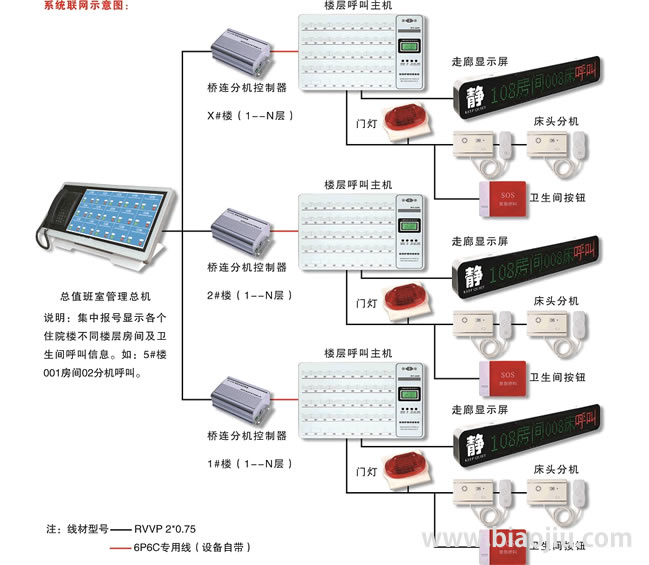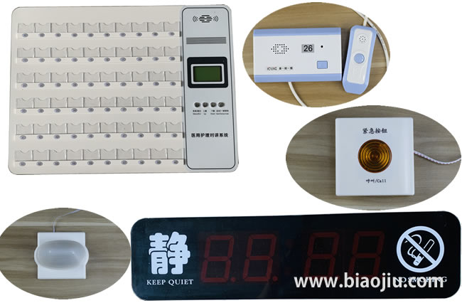 實現(xiàn)功能:主機分機互呼和語音通話對講,可在主機上自編設置3位數(shù)房間號和2位數(shù)床號,三種等級護理,系統(tǒng)廣播音樂播放、三色門燈、衛(wèi)生間緊急呼叫等實用功能。